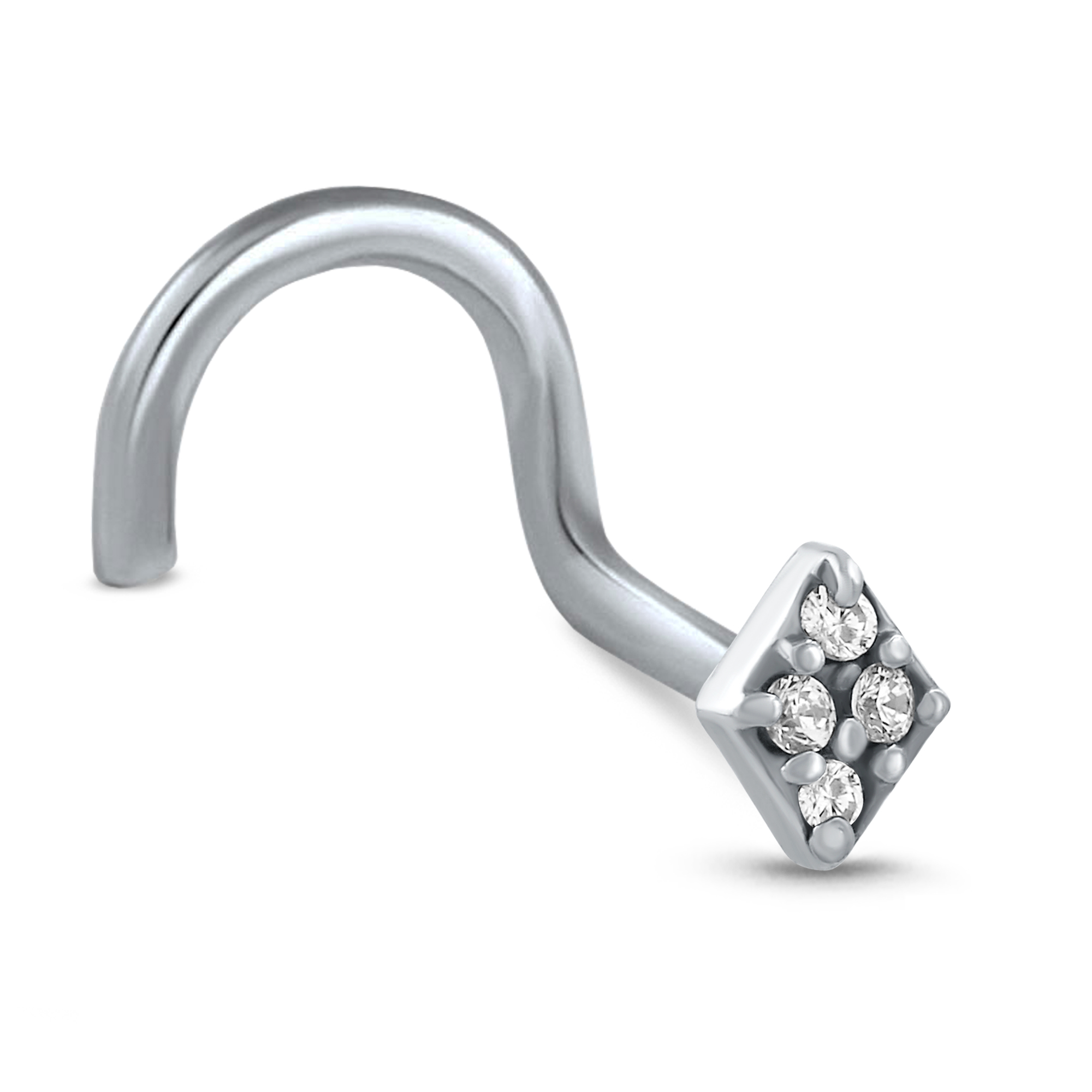 316L Surgical Steel Nose Stud featuring a diamond design with 4 sparkly, clear gemstones. Available in your choice of style.
